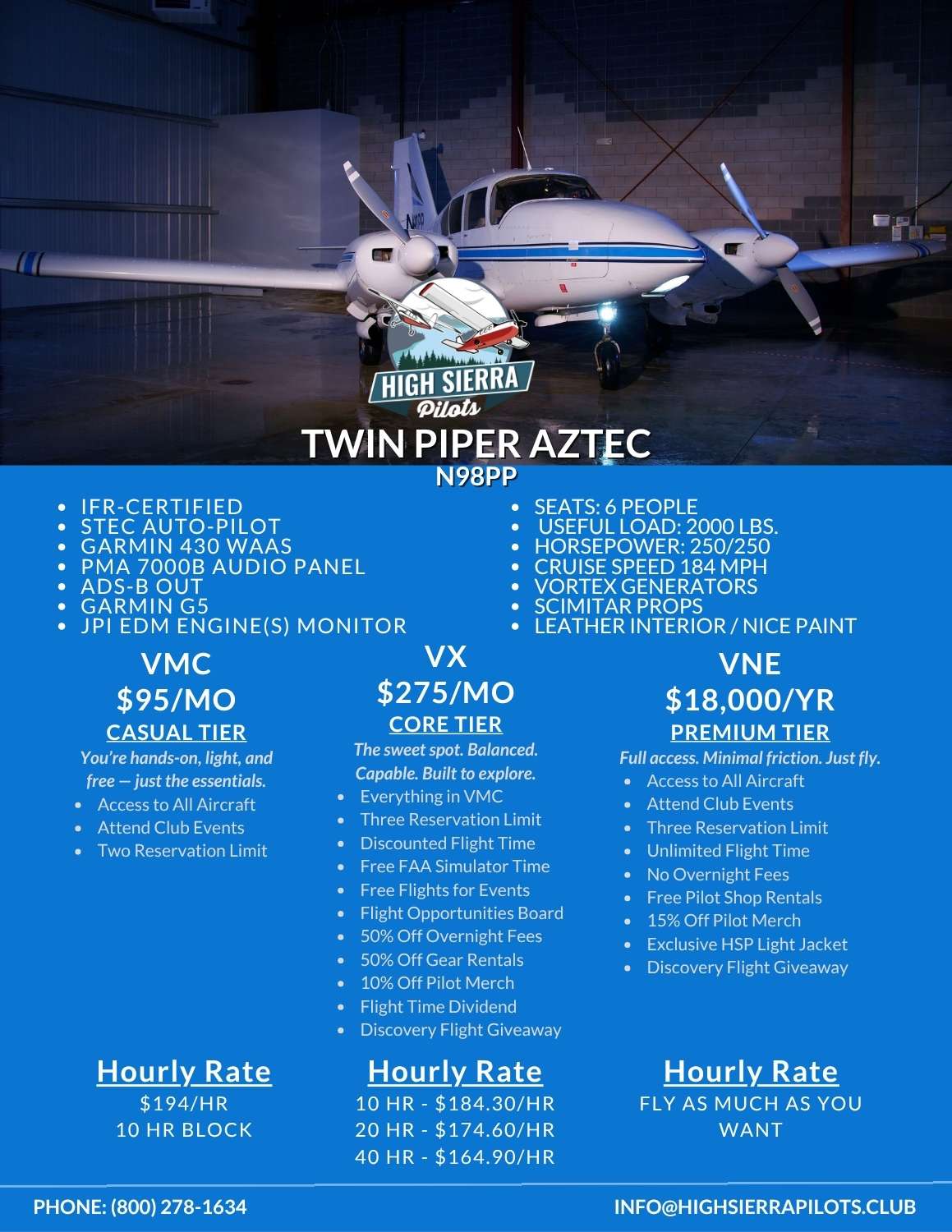 At High Sierra Pilots, every member has access to the entire fleet—including our aircraft, simulators, and training resources. When you join HSP, you’re not tied to a single airplane—you’re joining a community built around variety, freedom, and flexibility.