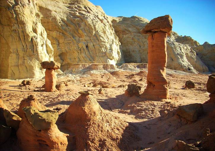 A wonderful surprise awaits you on the drive back from Kanab. On the north side of Hwy 89 between mile markers 20 & 19, you’ll see a parking lot and trailhead. A well-worn trail leads north into the GSENM; after less than a mile you’ll see an enormous red toadstool, or hoodoo. From here just wander up onto the plateau; you’ll be standing on hard clay. There’s no vegetation, just hundreds of these toadstools. Most have a white “stem” of soft Entrada sandstone, topped by a dark Dakota sandstone boulder. They were formed over eons as the Dakota rock prevented the soft Entrada below from being eroded by rain. Look around both east and west; the longer you stay, the more you’ll see, all shapes and sizes—it’s unforgettable. I had the strangest sensation of being on another planet. There wasn’t a sound or another person around.