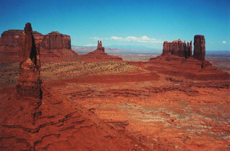 All of this erosion created the fantastic land forms you can see today. Studies suggest that Glen Canyon, at almost a thousand feet deep, was cut only within the last 500,000 years. If you are on Lake Powell you will see the Navajo and Wingate Sandstone canyon walls towering vertically for hundreds of feet; they continue far below the water level. In Monument Valley, all that is left of the layers is the great monuments themselves, surrounded by flat terrain.