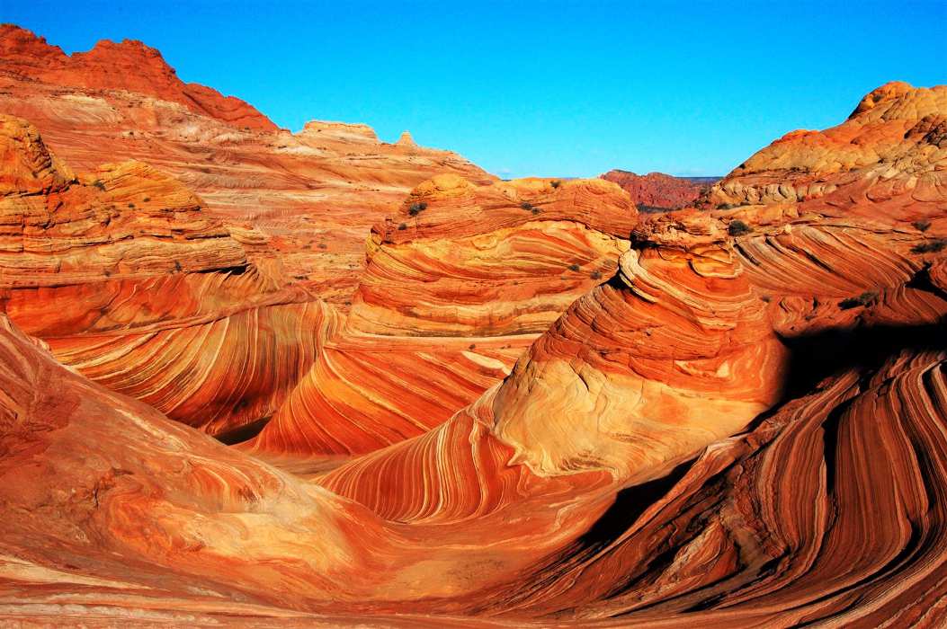 The BLM will also give you a map with photos of landmarks along your hike to The Wave, so you don’t get lost (there’s no trail in this Wilderness Area and you probably wouldn’t find it otherwise). We departed early and had the entire area to ourselves, but this was in mid-winter, and some years ago. It’s a pleasant 3-mile hike, first through a sandy wash, then over slickrock past colorful “teepees” of stacked sandstone. When you get to The Wave, walk around it, savoring the formations in the vicinity, and then approach from above—the colors and shapes will take your breath away.