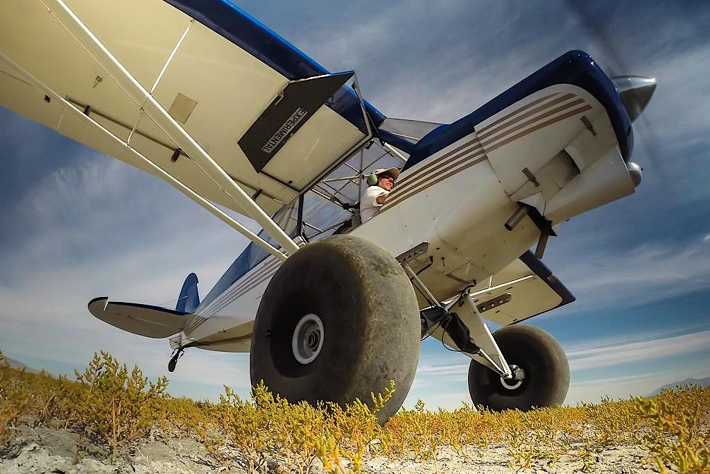 This was a few years ago and now the airplane anxiously waits for its Saturday morning exercises each week. I don’t fly it a lot in the winter but every weekend through the other seasons when the weather is good and I am in town I automatically head for the hangar. It is purely recreational and I find it very refreshing to explore, doors open, low and slow. Often I travel only a few minutes away to the shoreline of the Great Salt Lake. It’s flat with no rocks or obstructions and a fun place to practice landing and take offs with all sorts of techniques. The shoreline can be deceiving though and the ground can appear dry when it is not. I have known more than one who unexpectedly sunk a nose wheel in mud that looked completely dry. The consequence can be dire, often flipping the aircraft on its back. My big tires and light aircraft weight reduce the risk but I am ever cautious about the conditions. I never land without rolling a wheel for several hundred yards first. Insuring no mud gets flipped up on the wing indicating wet conditions. I have learned a lot about the plane out playing on the lakebed. Equally important I simply have fun. It reminds me of riding dirt bikes when I was young, except this is a lot better. When I come back I feel energized and refreshed.