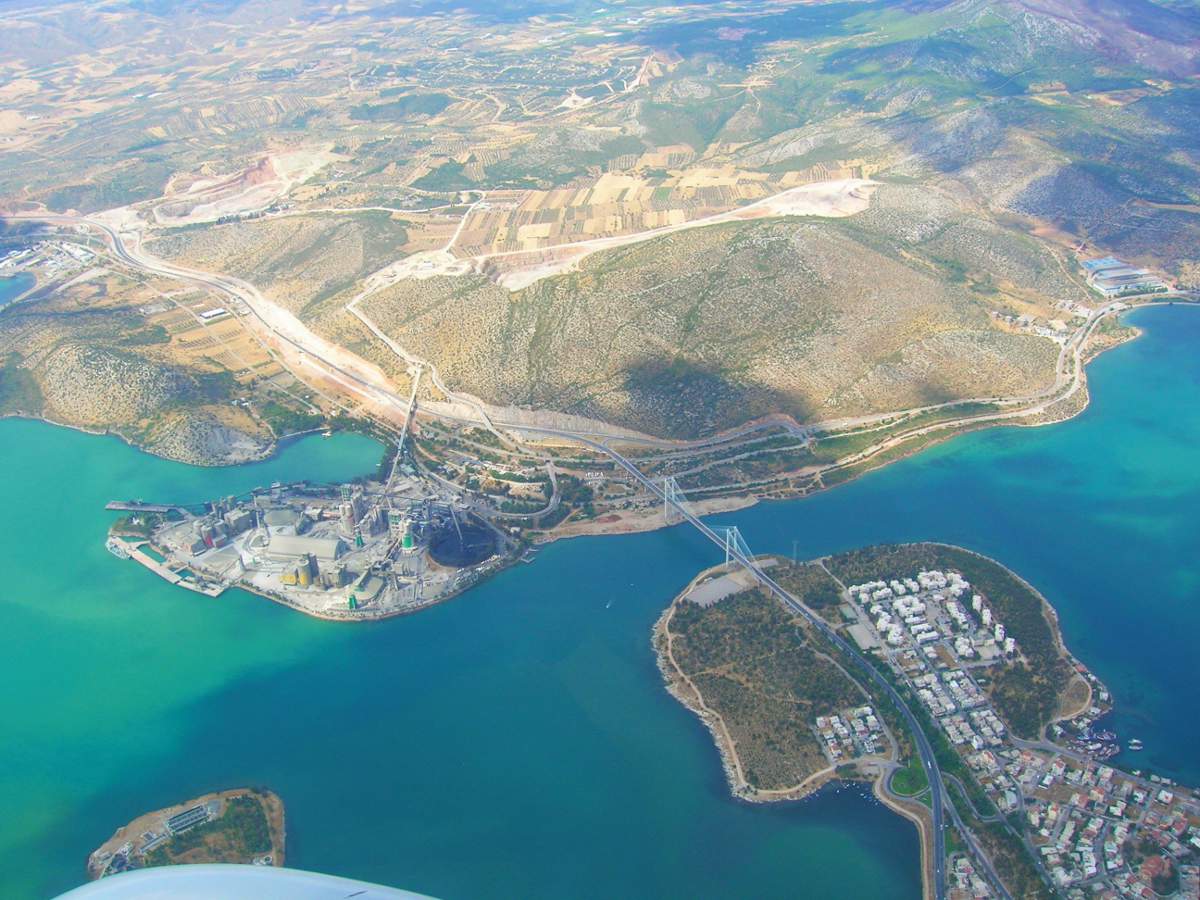 On a 309° heading, we are already flying over Evoikos Gulf (the sea between the Greek mainland and the island of Evia), approaching the city of Halkida (or Halkis), named after the daughter of Asopos according to the mythology, but more likely due to the involvement of the ancient inhabitants with mining copper (halkos). On the left-hand side there are shipyards and a cement factory.